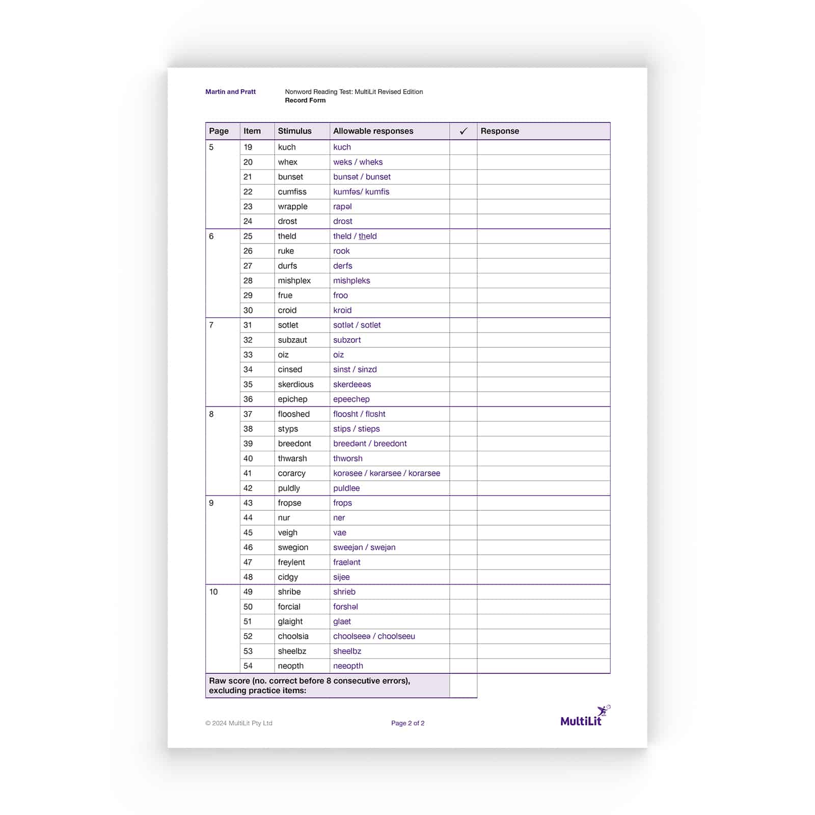 Martin and Pratt Nonword Reading Test (MultiLit Revised Edition) Record Forms