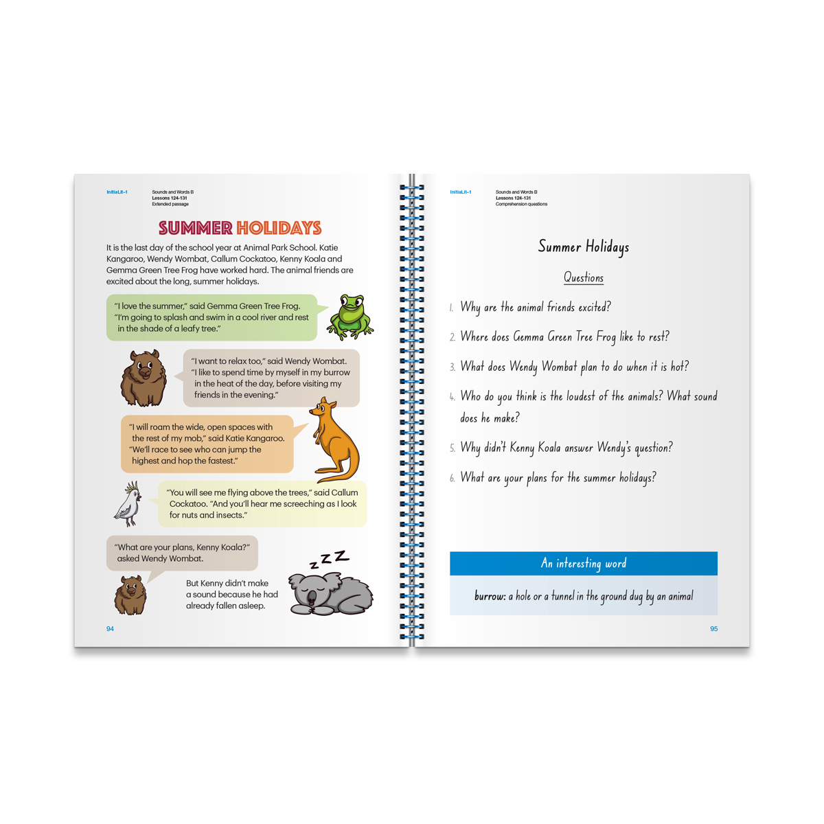 A pack of 6 InitiaLit–1 Sounds and Words Books B for use with a small group of (up to 6) students, during rotations after whole-class instruction (each student in the group will need a book). These books provide word, sentence and text reading practice with teacher supervision, aligned with Lessons 78-131 of the InitiaLit–1 program.
