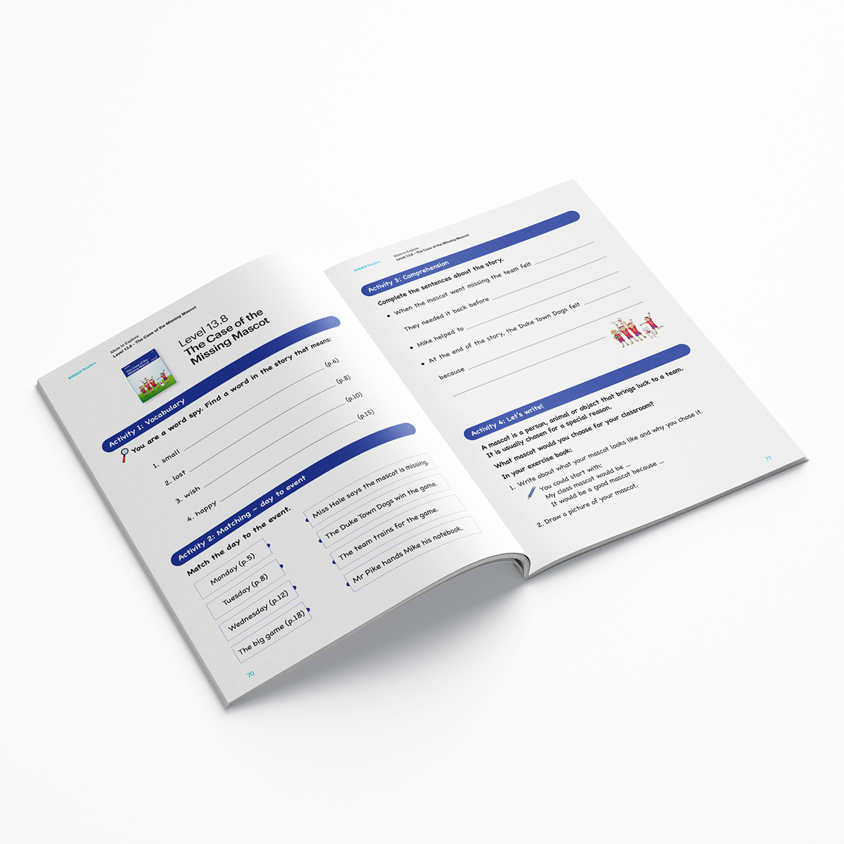Two pages of activities are devoted to each Reader, covering a variety of written formats. Tasks include answering questions, sequencing and predicting. Word work on the target sound in each Reader is also included. The activities are scaffolded to support children as they move through the InitiaLit Reader sequence.