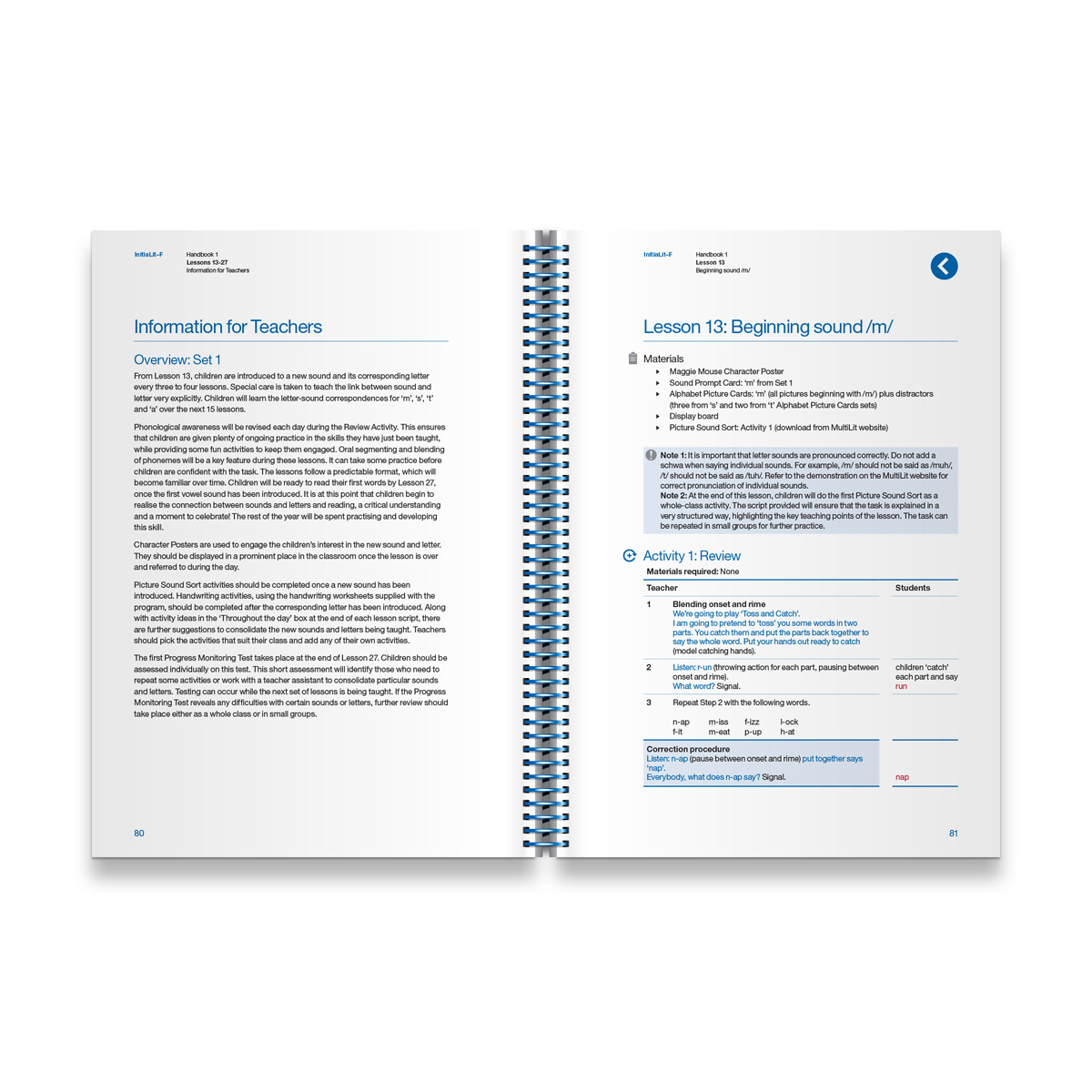 First Handbook in the InitiaLit–Foundation program, containing Lessons 1-27 for daily whole-class instruction. Lessons 1-12 cover the phonological awareness skills of rhyme identification, syllable segmenting and oral blending of word onsets and rimes. Lessons 13-27 work on oral blending and segmenting of three sounds, while introducing phonic Set 1: m, s, t, a.