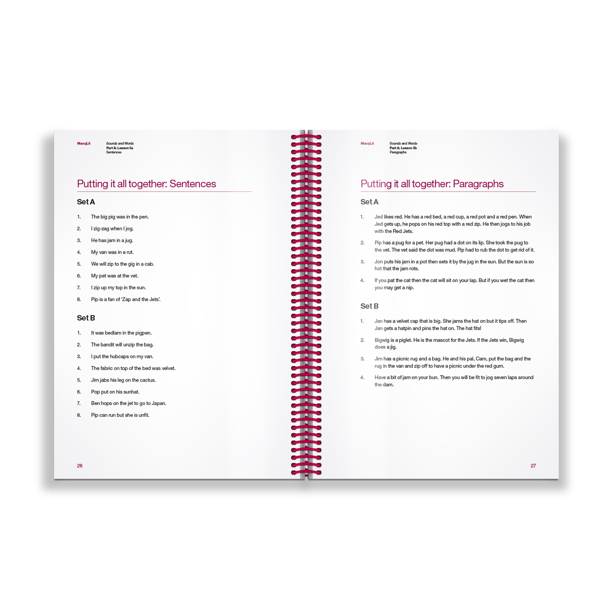 One copy of the MacqLit Sounds and Words Book – Parts A-C for use within the small group MacqLit lesson (each student in the group will need a book). These books provide word, sentence and text reading practice, aligned with Parts A-C of the program.