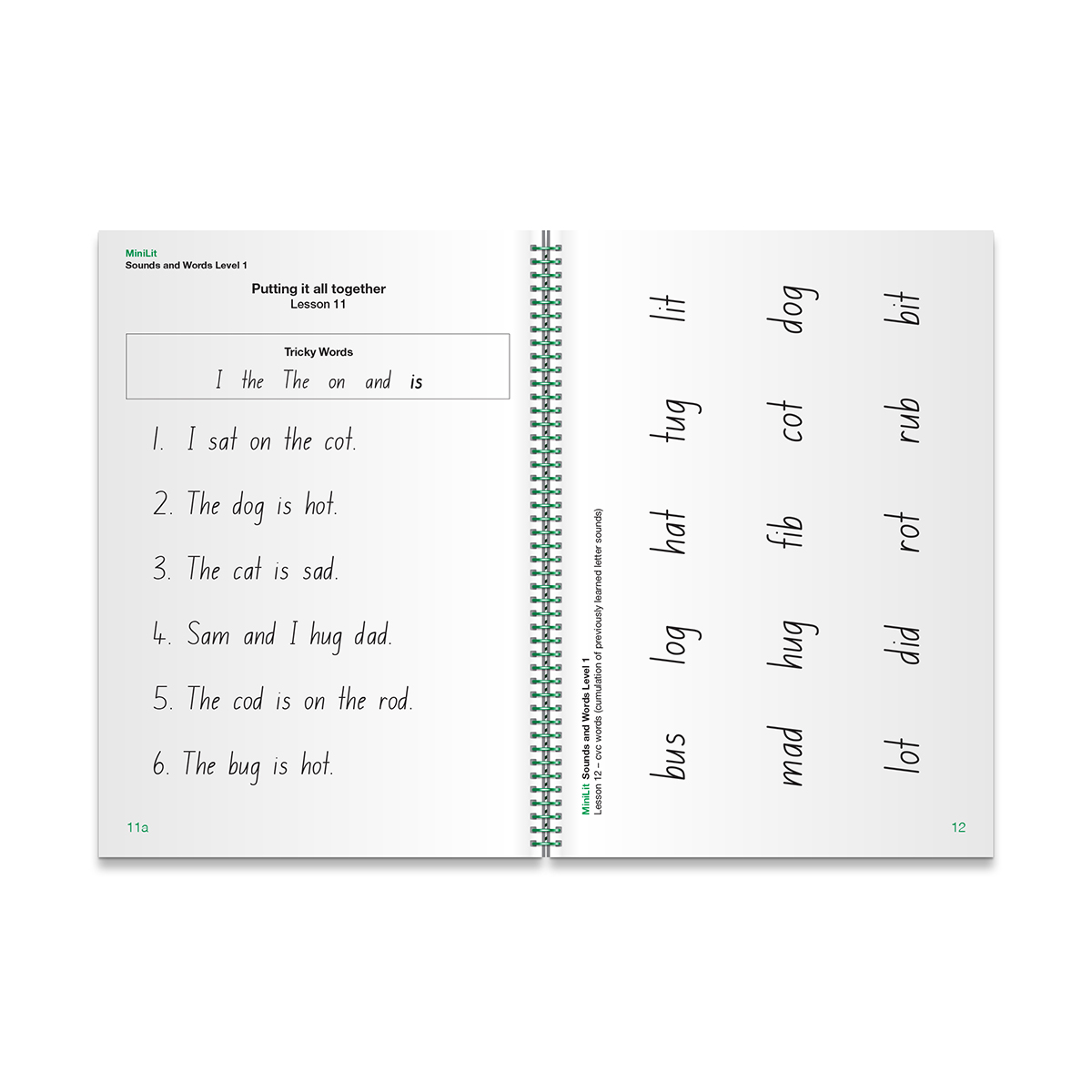 Five copies of the MiniLit Sounds and Words Book – Level 1 for use within a small-group MiniLit lesson (each student in the group will need a book). These books provide scaffolded practice in reading sounds, words and sentences aligned with Lessons 1-40 of the program.