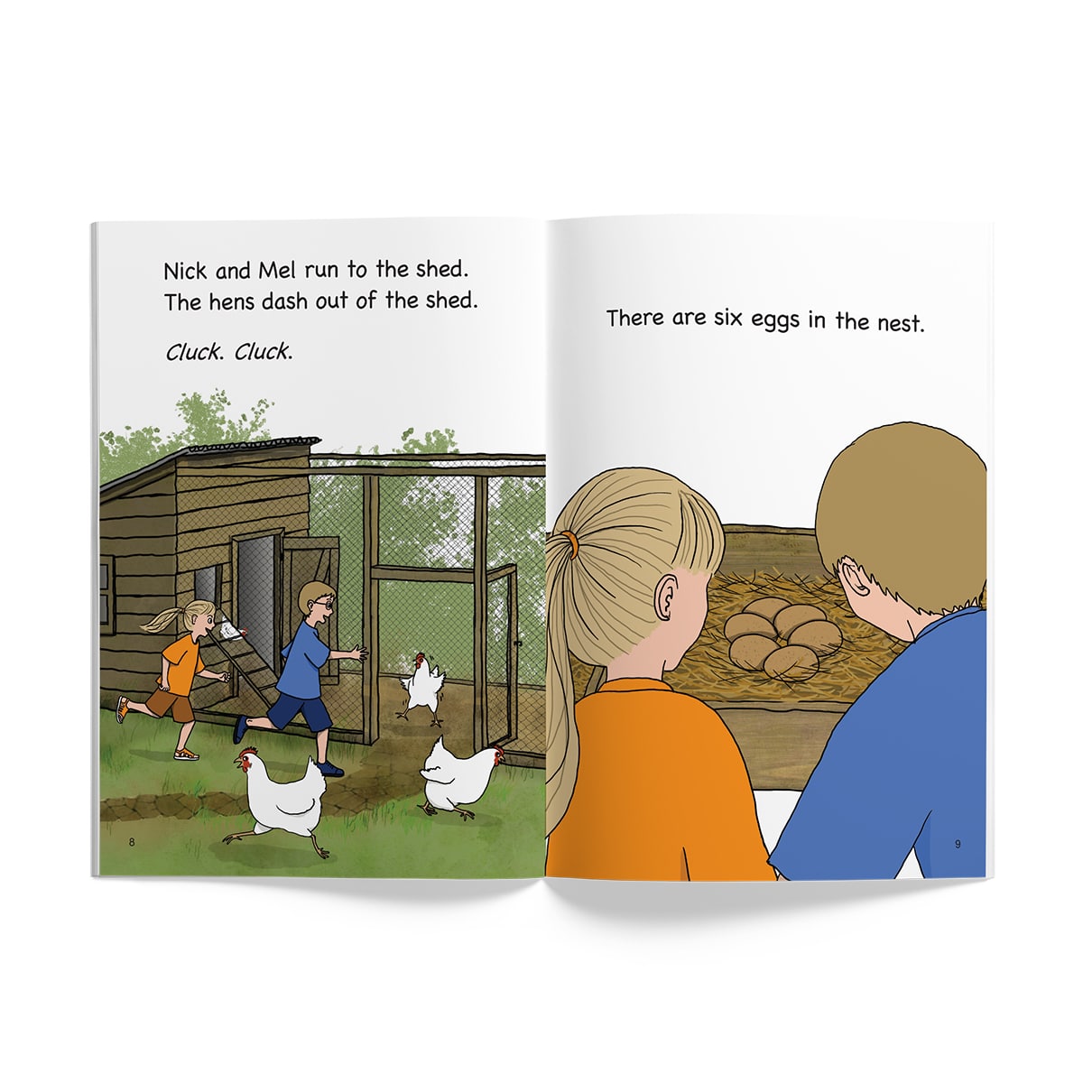 Nick and Mel cannot wait to see the chicks hatch. This Level 10 reader in the InitiaLit Readers sequence focuses on all sounds covered in Levels 1-9. (Author: Lara van Rooyen, Illustrator: Janet Tiitinen) The InitiaLit Readers Levels 10-16, Series 2, The Wattle Series are carefully scaffolded for children in their second year of school to practise their developing reading skills, following the InitiaLit–1 phonic sequence, and should be purchased by schools using the InitiaLit–1 program and MiniLit Sage. Full sets of Readers (Levels 10-16), bundle sets for each level (10-16) or individual titles can be also be purchased by parents wishing to support their child’s reading, or by any school wishing to provide decodable readers to support an evidence-based synthetic phonics approach to teaching reading. Each title includes instructions and pre- and post-reading activities to help teachers and parents use the books effectively.