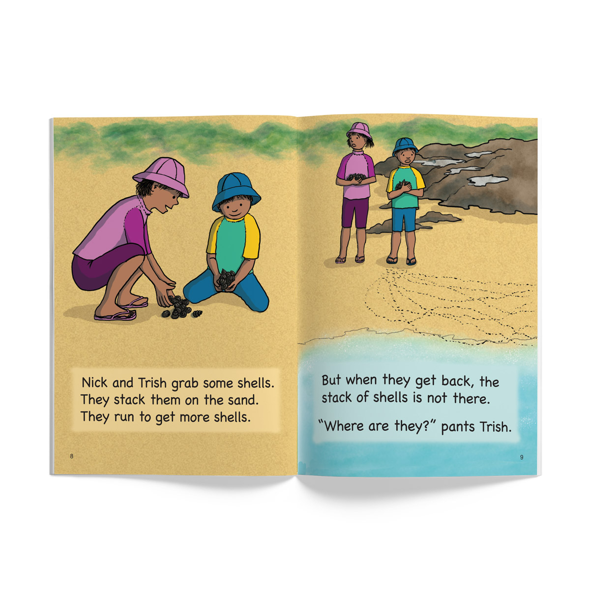 Trish and Nick collect shells but the shells keep disappearing. Where have they gone? This Level 9 reader in the InitiaLit Readers sequence focuses on consonant blends (CVCC and CCVC words). (Author: Colette Read, Illustrator: Janet Tiitinen)