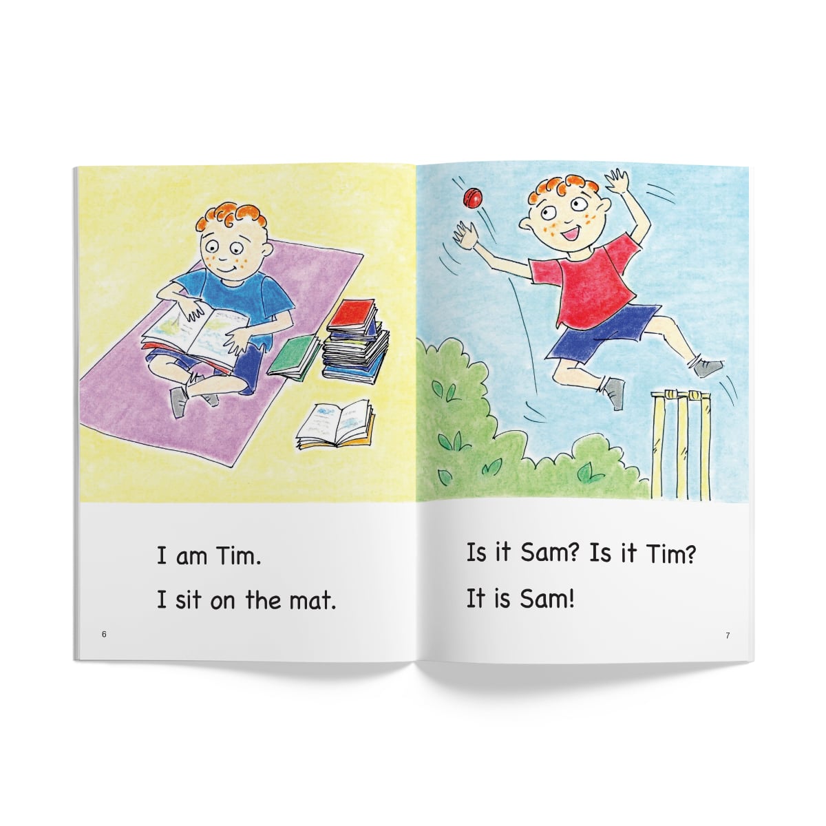 Sam and Tim are twins. Can you tell who is Sam, and who is Tim? This reader focuses on the Level 1 sounds in the InitiaLit Readers sequence: m, s, t, a, p, i, f, r. (Author: Trudi Burnell, Illustrator: Wendy Schuster)