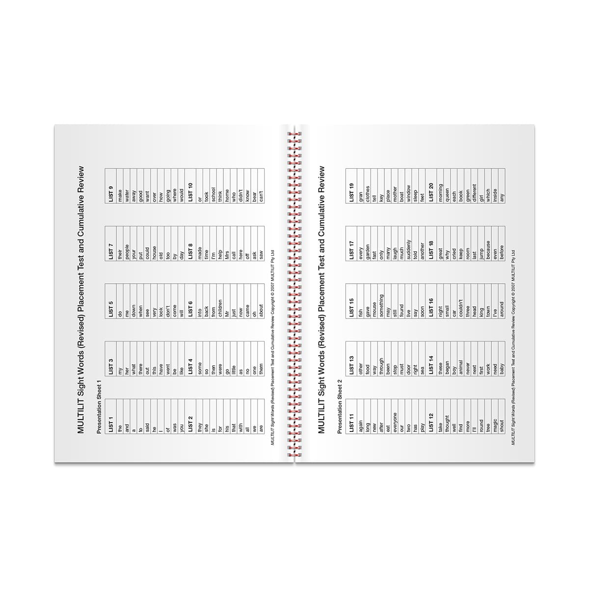 A manual providing instructions and the placement test and cumulative review presentation sheets to be used during the Sight Words component of the RTP lesson. These tests will be used to place a student at a particular level on the Sight Words component of the program, and to check that all sight words have been mastered by the end of the program.