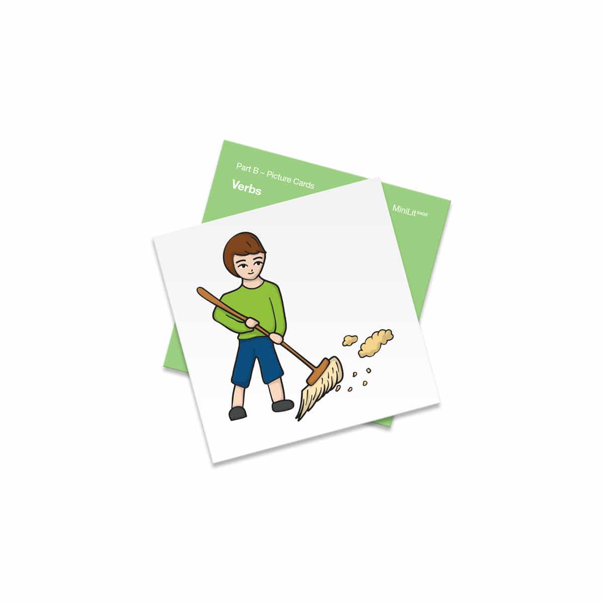 A set of sturdy, glossy picture stimulus cards (100mm x 100mm) used during small group MiniLit Sage lessons for Part B, as directed in the scripts, to support teaching of verbs. A set of the cards are included in the MiniLit Sage Kit.