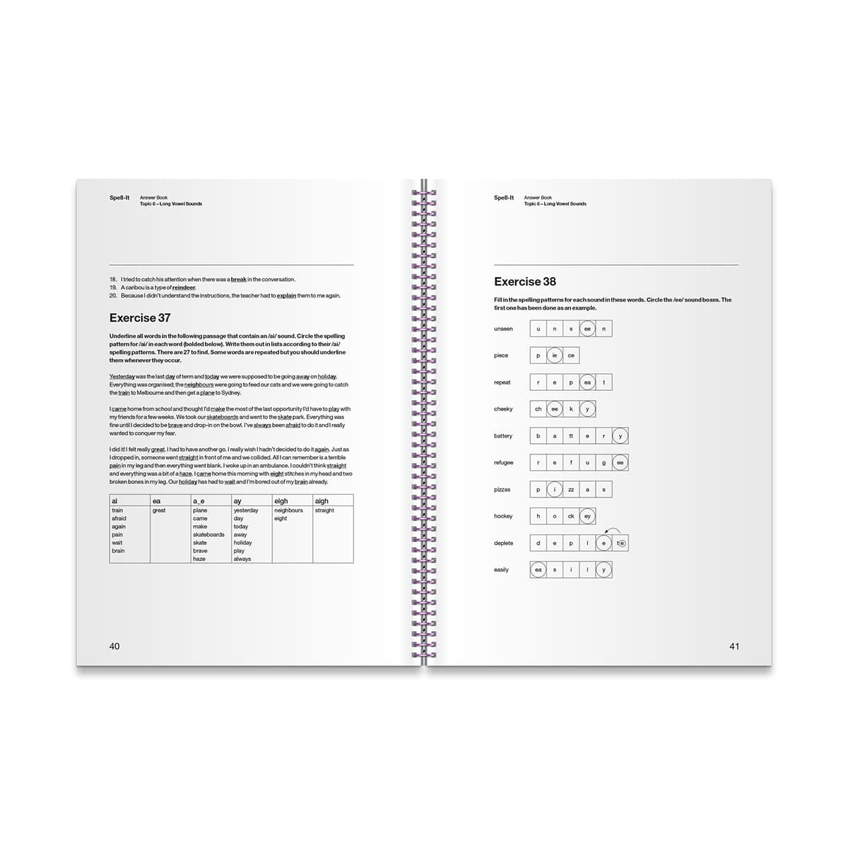 A reference book for the teacher, providing all answers to the exercises in the Spell-It Activity Book. Teachers choose appropriate exercises from the Activity Book to accompany their lesson, which may vary for different groups of students. Teachers can then correct these exercises using the Spell-It Answer Book. Regularly monitoring students’ progress will help teachers determine when to repeat instruction or move on to a new teaching topic.