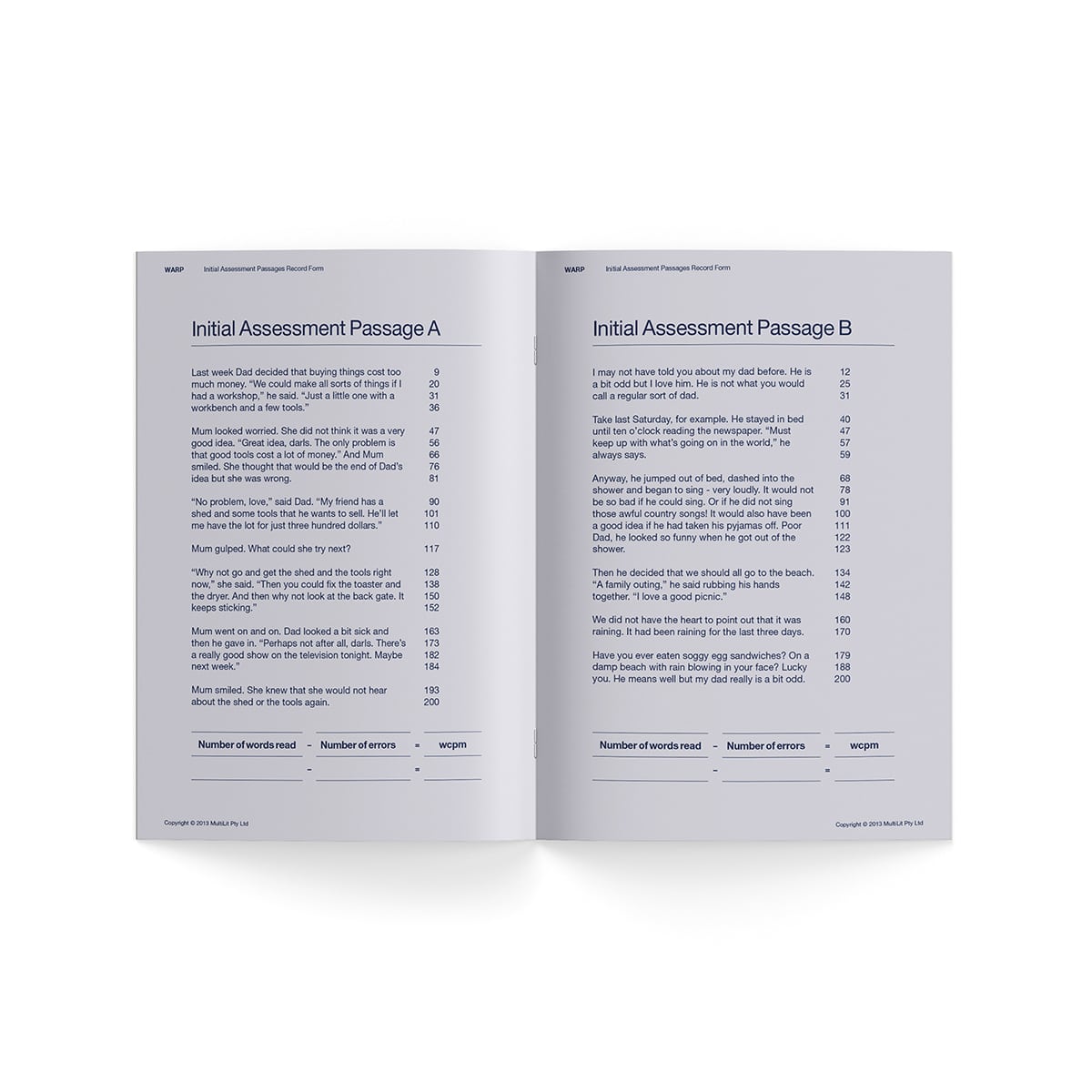 A pack of 30 Initial Assessment Passages Record Forms, used to record a students’ score when completing an initial assessment for the WARP (Wheldall Assessment of Reading Passages). The WARP is designed to assess older students’ (Years 2 to 5, including low progress readers up to Year 9) oral reading fluency.