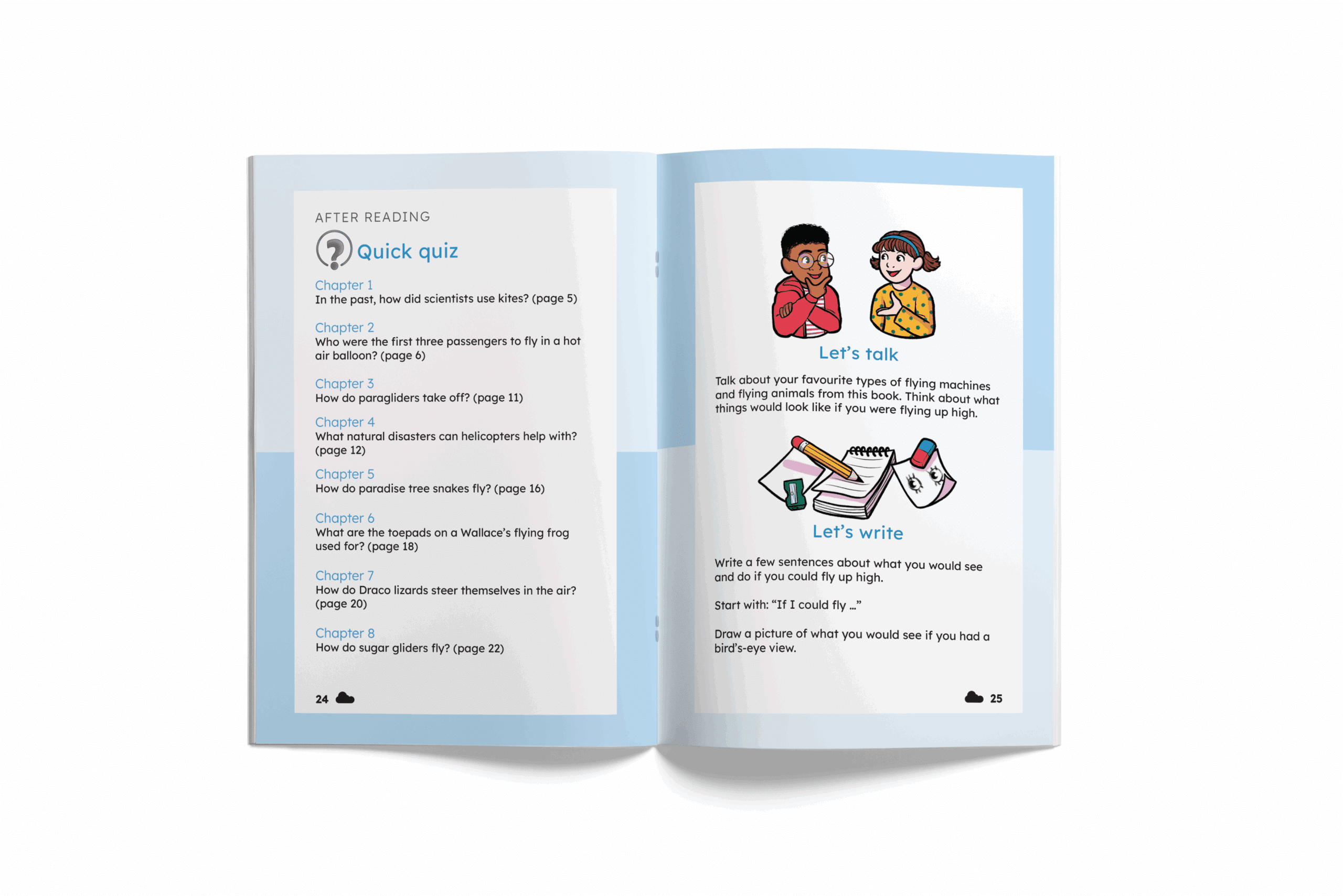 Each non-fiction book contains some preview activities, and comprehension activities at the end of the book, including a quick quiz and discussion prompts to prepare for a simple writing task.