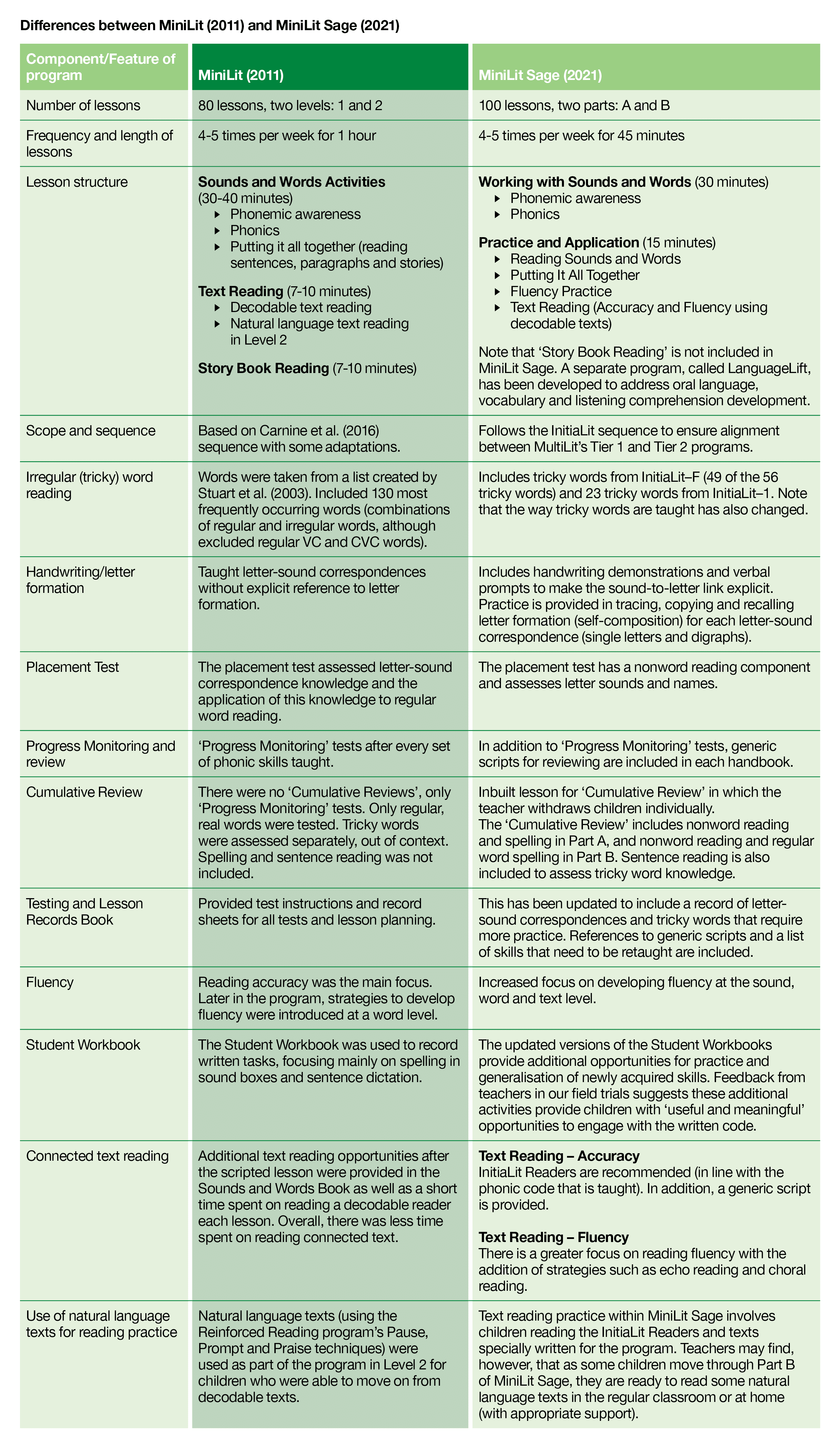 MiniLit Sage is the first major revision of the MiniLit program, originally launched by MultiLit 10 years ago. It is a Tier 2 small group reading program for students in the bottom 25% of the expected range for their age group in Year 1 and 2. The program provides explicit instruction in phonemic awareness, systematic synthetic phonics for reading and spelling, letter formation, and connected text reading.